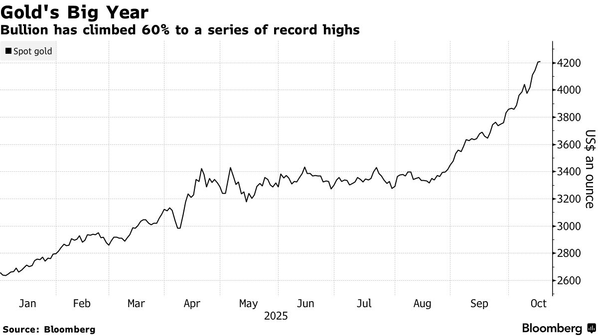 此外,美国联邦政府持续停摆也给黄金提供了支撑。所谓的“货币贬值交易”(debasement trade)也在升温,投资者为防范因预算赤字失控而导致的主权债务和货币贬值,纷纷转向黄金等实物资产。各国央行的强劲购金需求亦是关键支撑因素之一,使得黄金价格今年迄今累计上涨约60%。